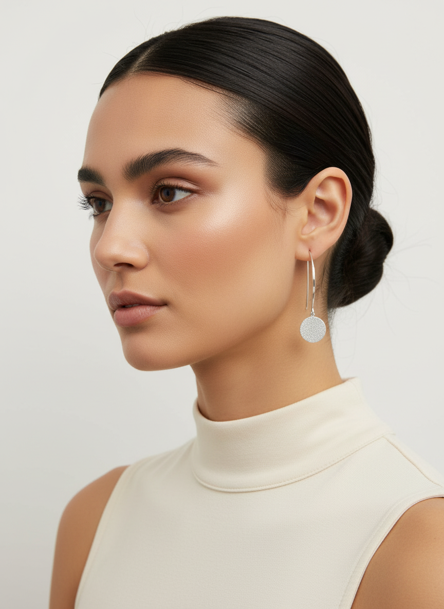 Crafted by BOO, these handmade earrings feature a dotty textured disc suspending 50mm from a hook design, adding a playful element to any attire while giving a stylish touch.