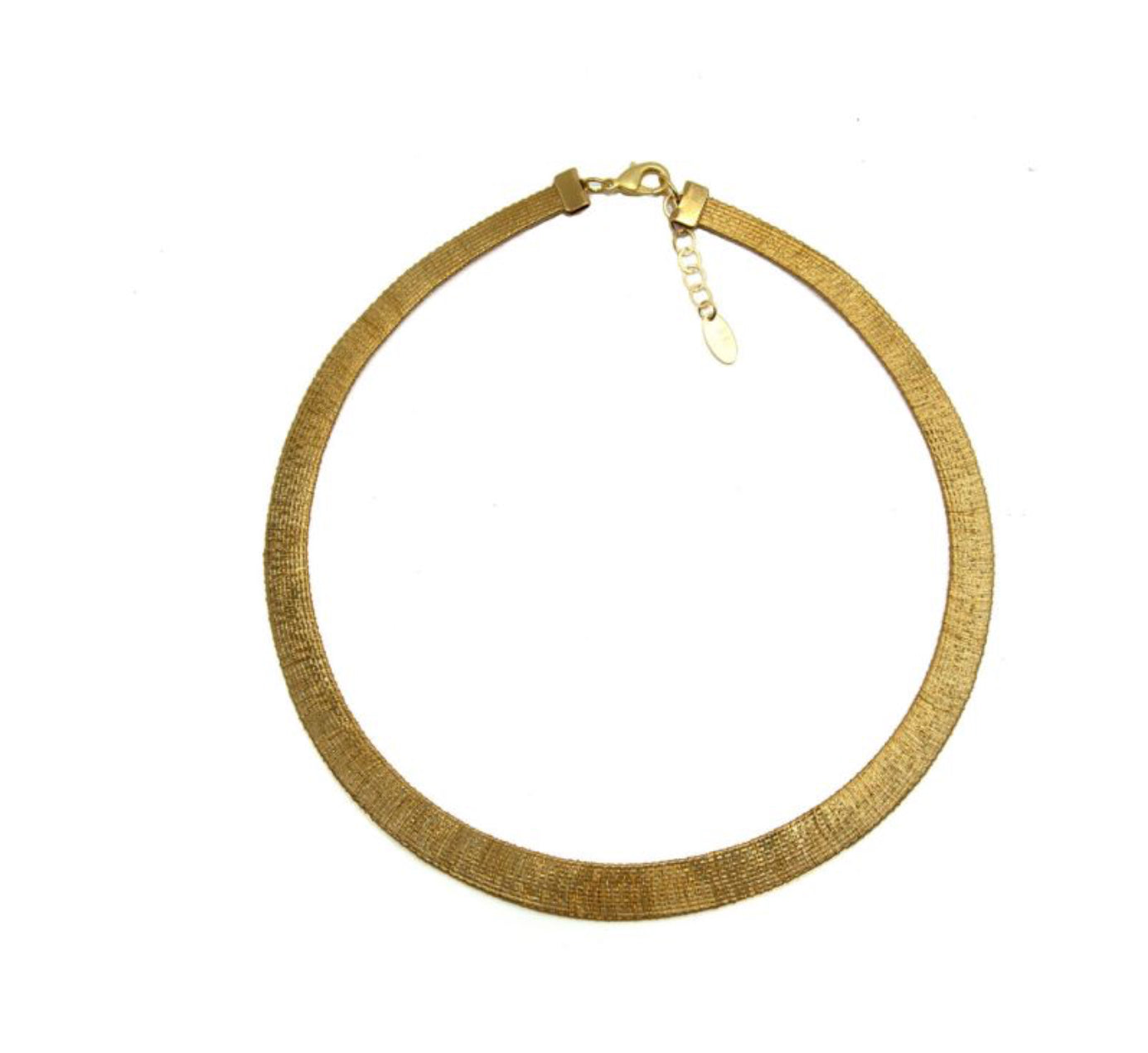 Fotini Liami's expertly handmade necklace transforms a piece of gold plated bronze into a fabric-like material. Beautifully textured, it will sit elegantly on your loved one's neck.
