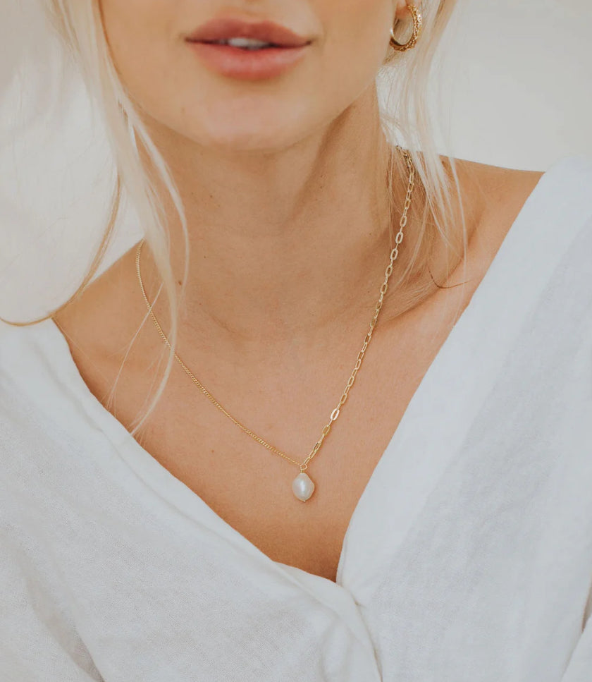 Discover our timeless gold Pearl chain necklace, featuring a beautiful 11-15mm ivory pearl. This unique piece combines two classic chain styles - belcher and paperclip - creating a modern spin on the classic Pearl Necklace and a stylish accessory perfect for elevating everyday looks or special occasions.