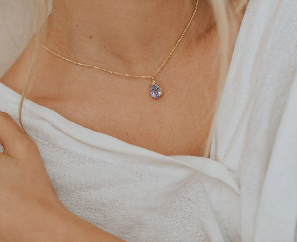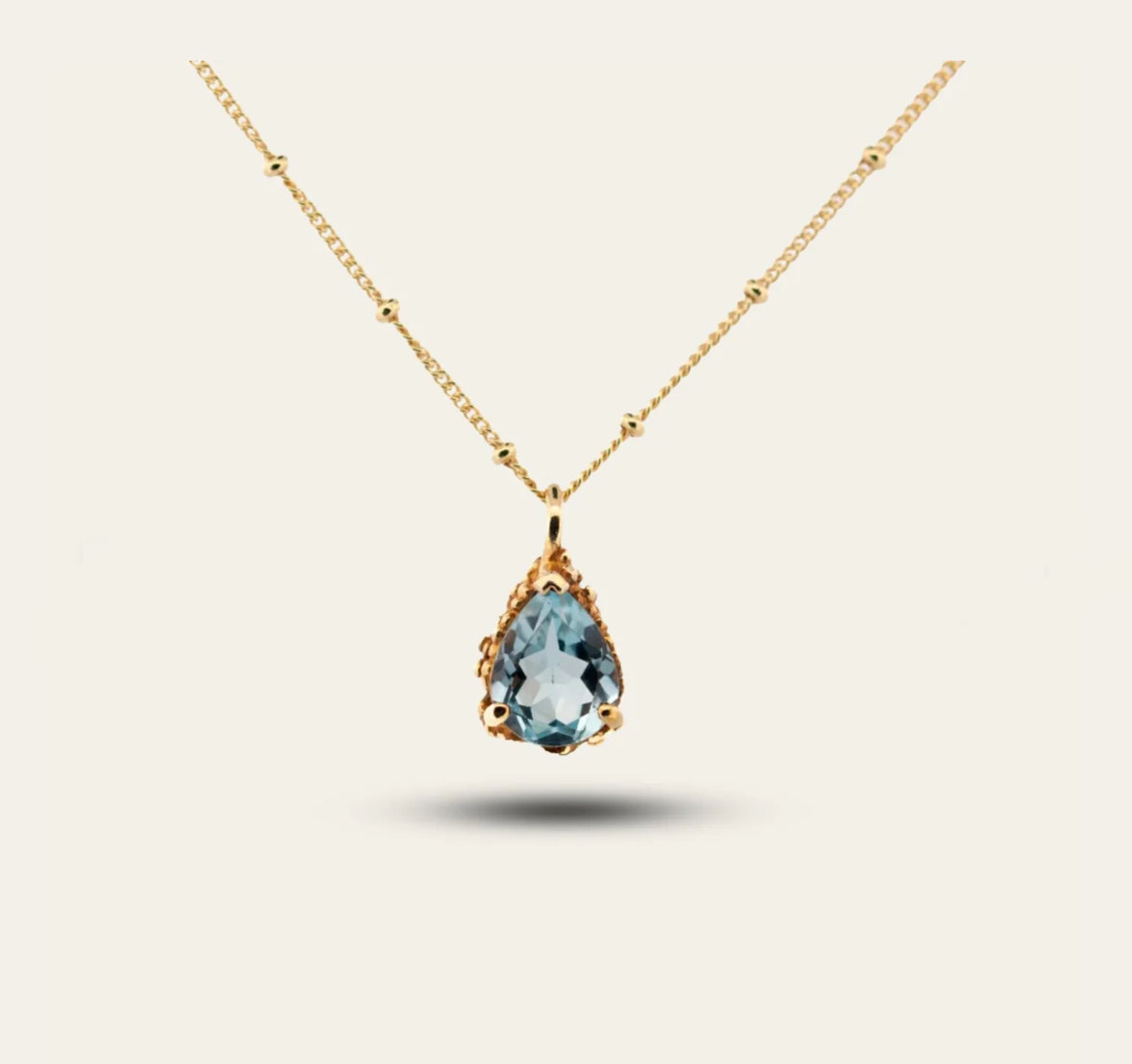 At its centre is a 10x8mm pear-cut sky blue topaz gemstone, reflecting stunning ocean hues that shift with the light. The necklace features a 45cm/18" gold vermeil satellite chain, with a 1.5cm pendant.