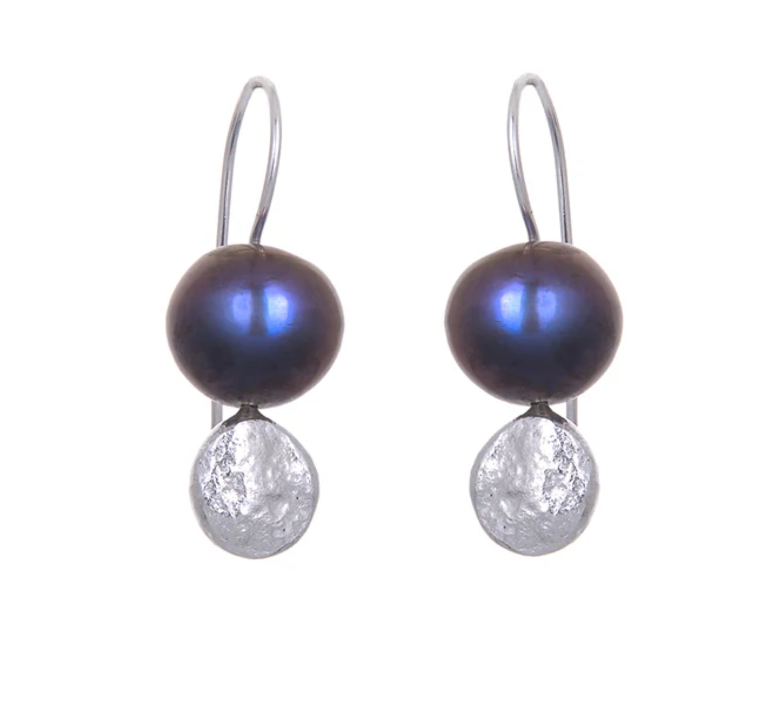 A beautiful rustic ridged peacock pearl sits perfectly with the textured, recycled sterling silver, dot on these earrings that drop down. A classic earring with a twist.