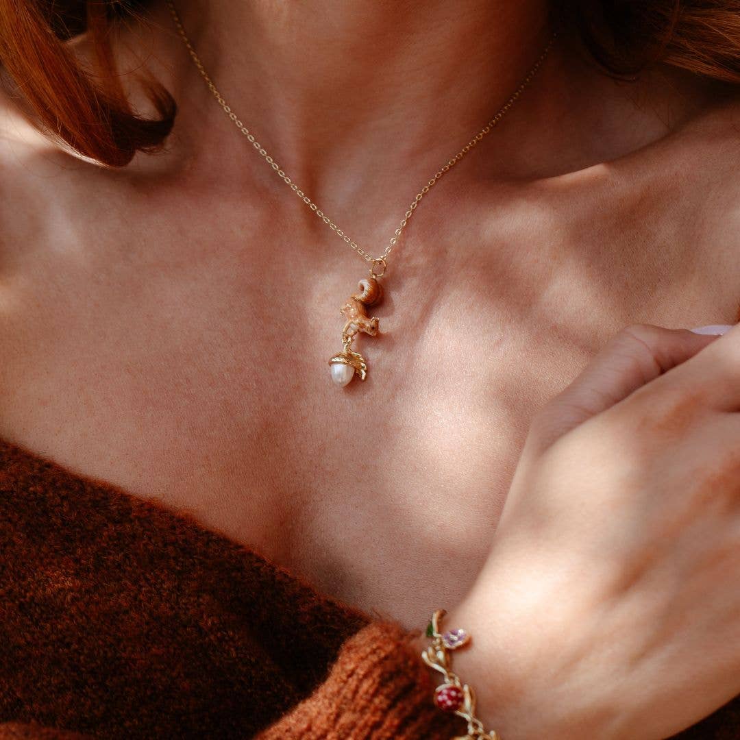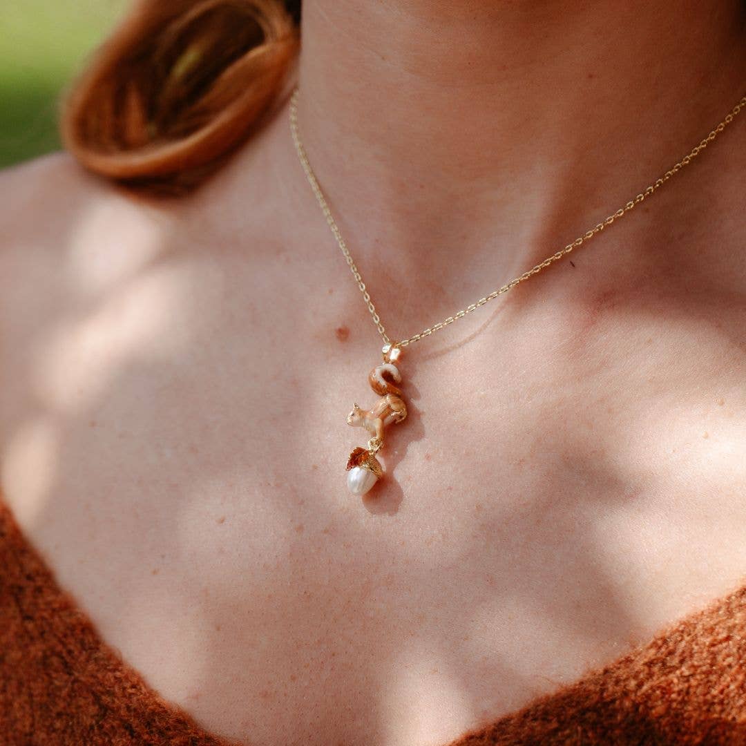 This pendant is full of charm and character, featuring a hand painted red squirrel, and a pearlised acorn drop, presented on an elegant 18ct gold chain.