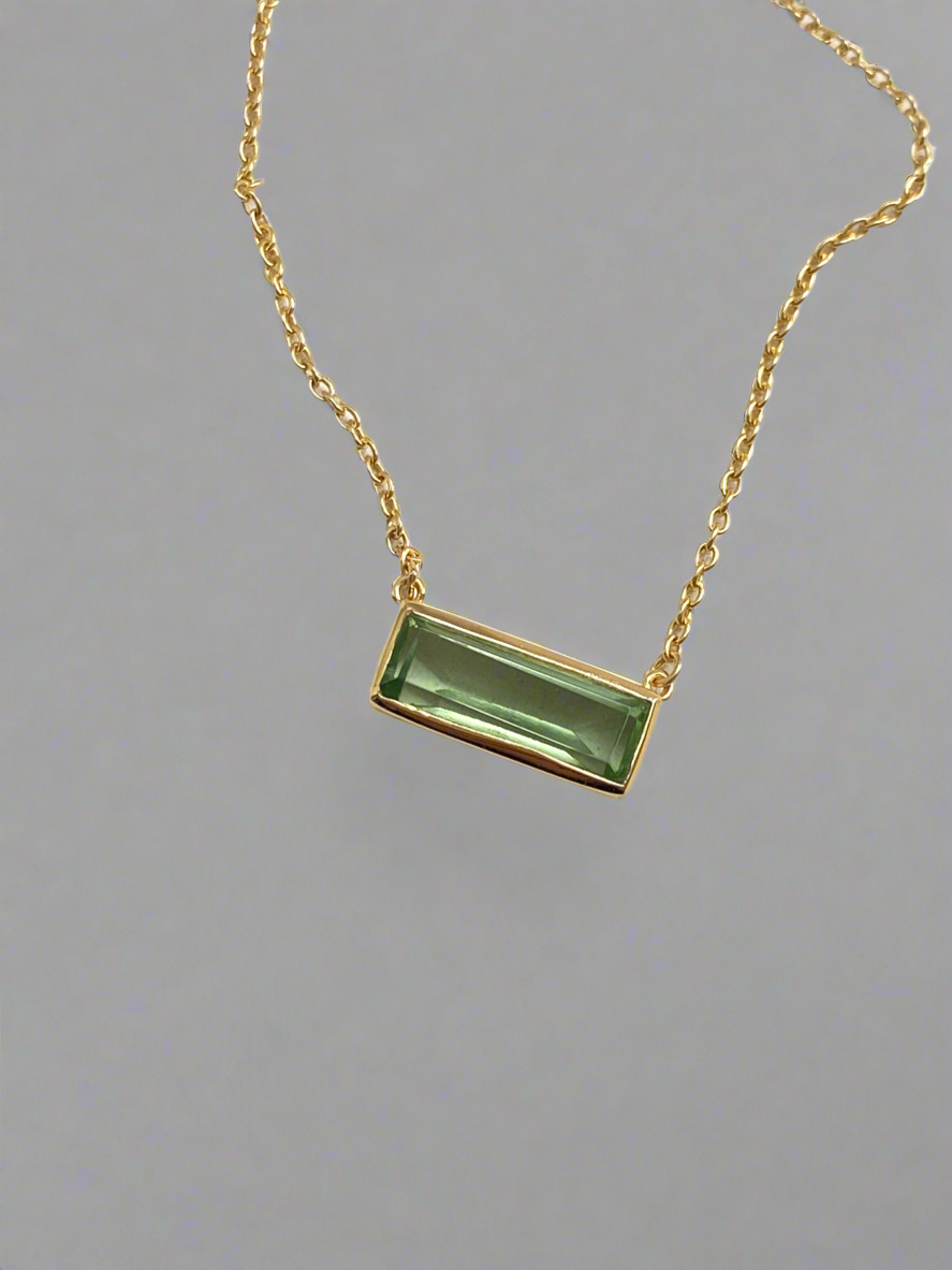 This exquisite pendant features a green amethyst stone set on an 18 k gold plated chain, creating a sophisticated and luxurious piece of jewellery