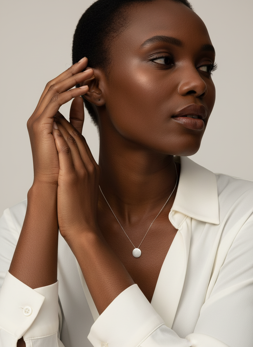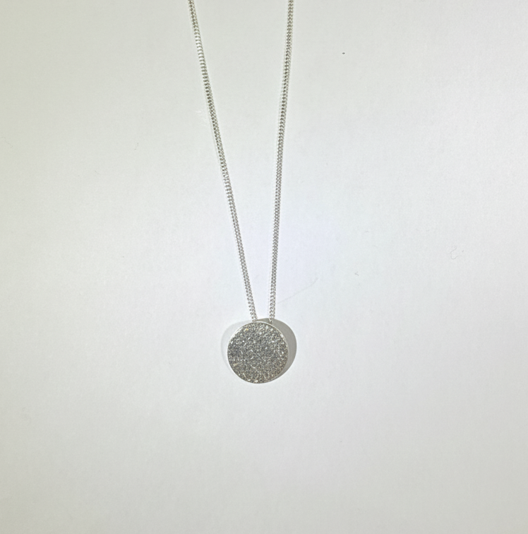 This unique necklace from BOO showcases a textured disc on a dainty chain.