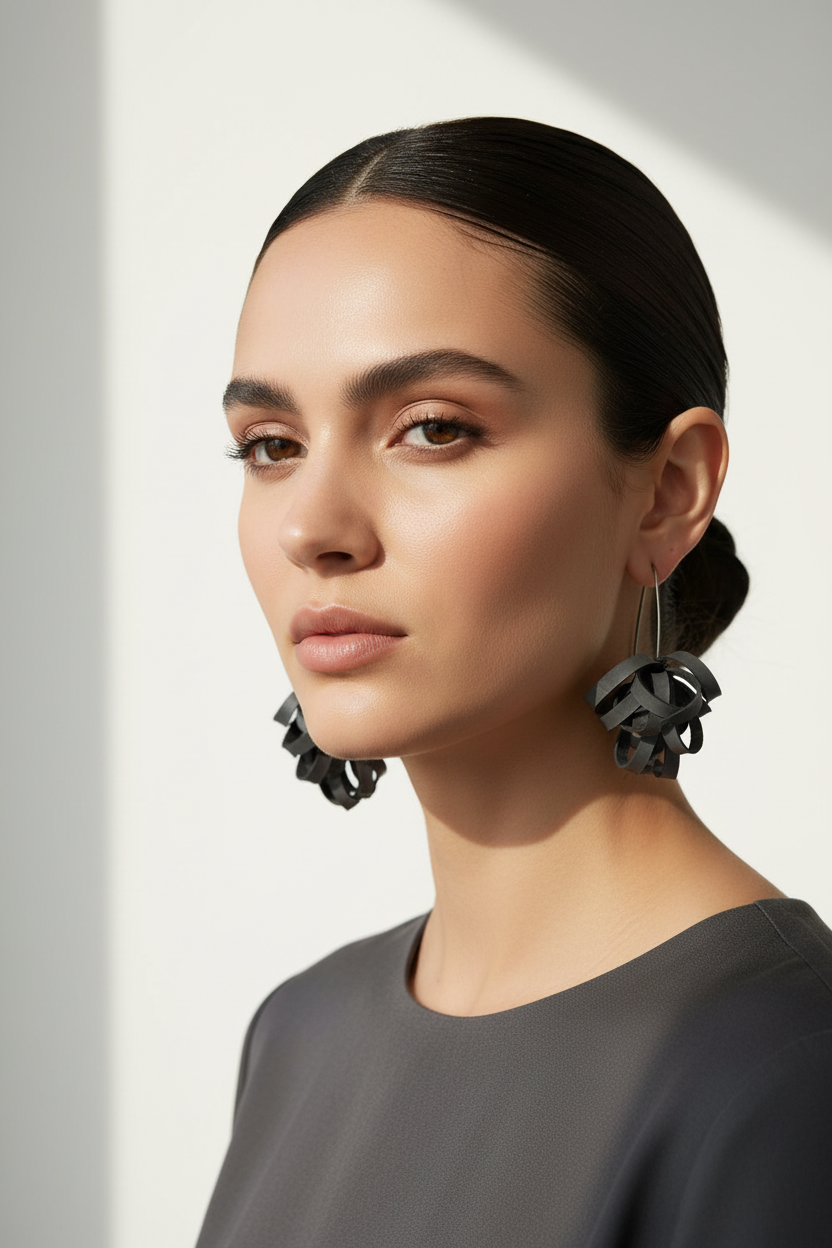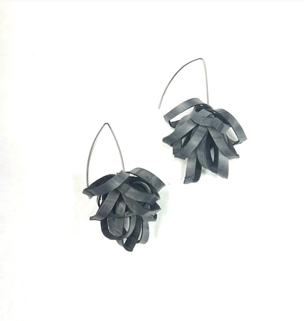 These super light upcycled rubber earrings are a joy to wear; very flattering and soft and flexible with a shape resembling Pom poms! There are four hand painted colours available as well as the black raw rubber. These feature fine raw rubber Pom poms are avaible on stainless steel hooks or chains with a matching Pom Pom necklace in an adjustable lariat design.